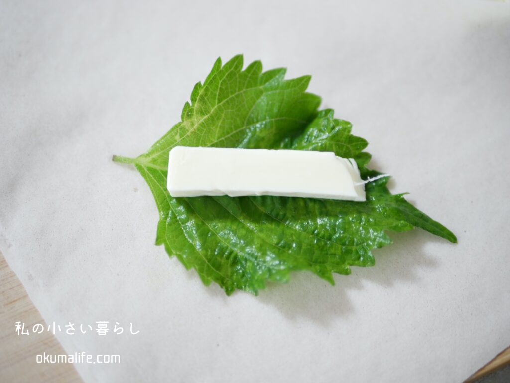 春巻きの皮に大葉とベビーチーズを乗せ、春巻きの作り方と同様に包みます。