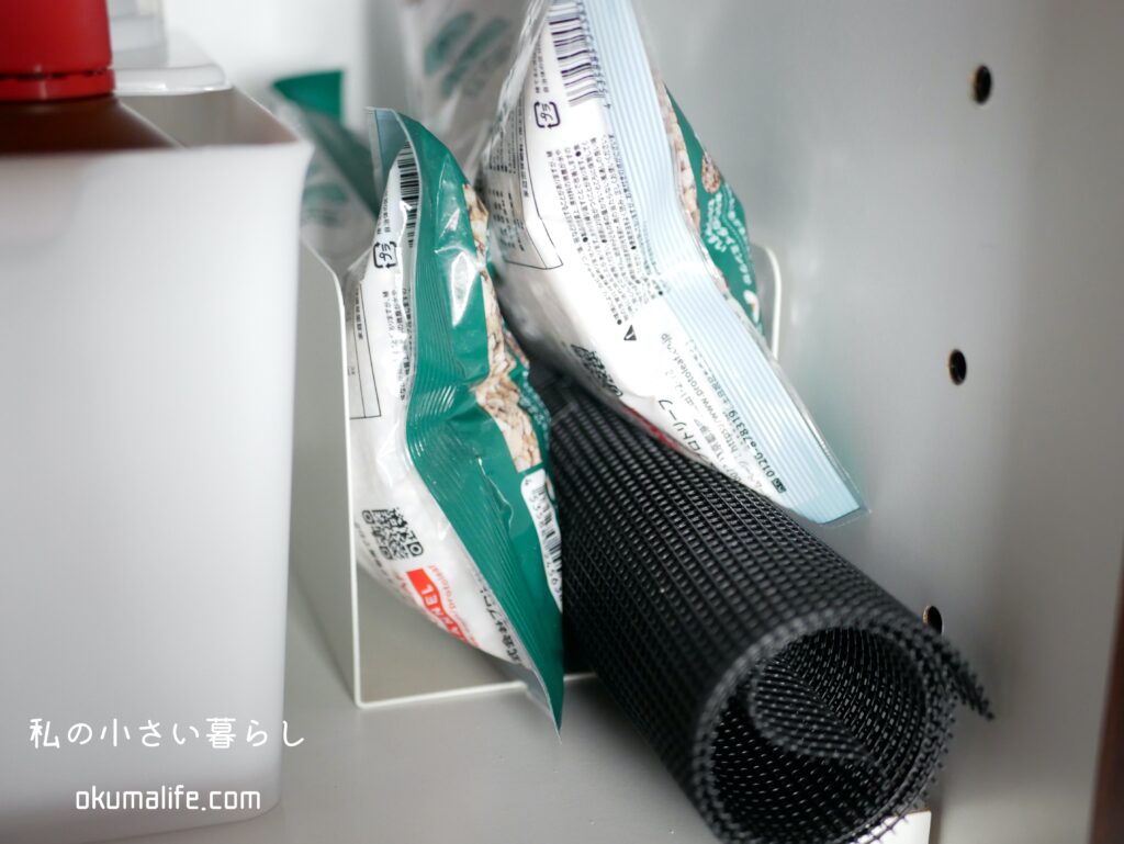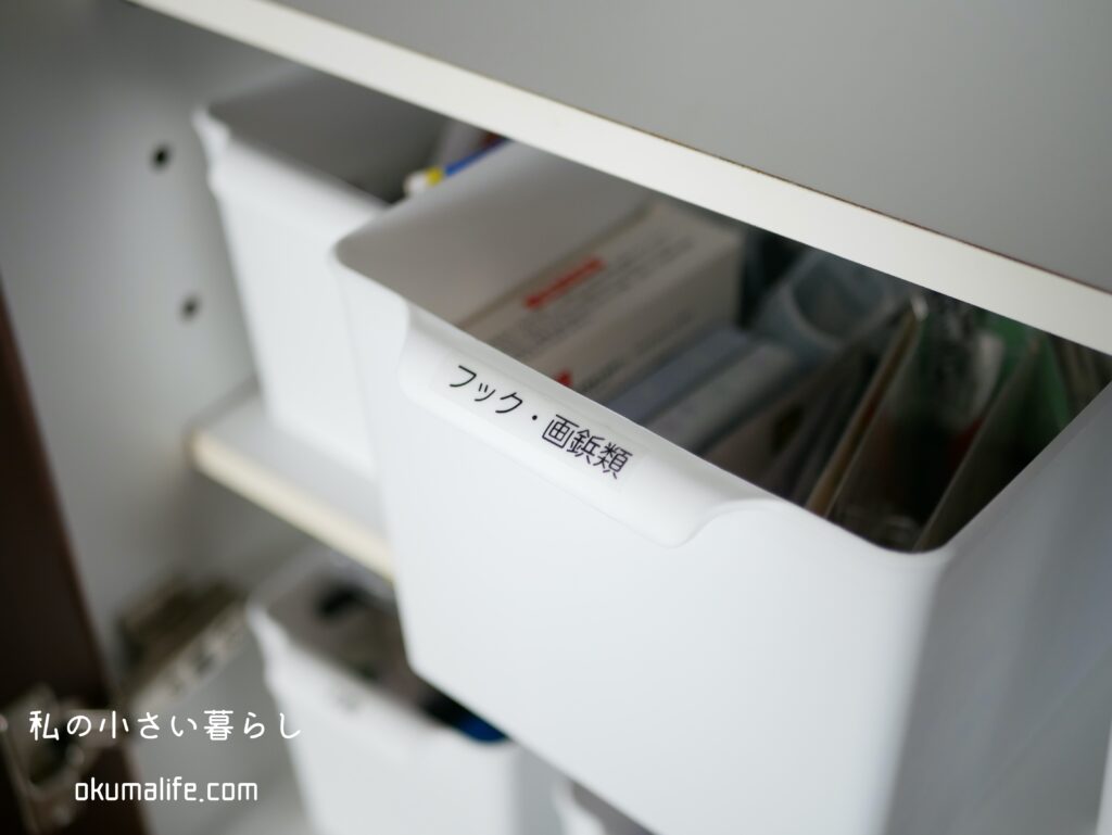 この取手の部分にラベルが貼れるので、立ったままでも何が入っているのかわかりやすいです。