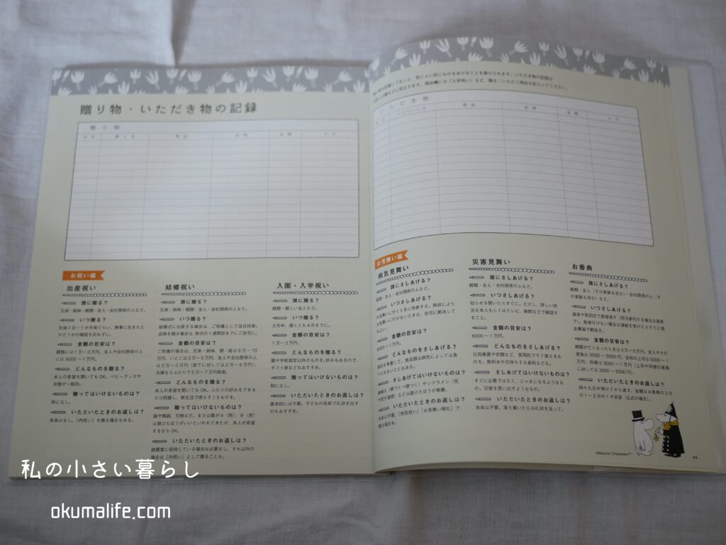 左のページには贈り物、右のページには頂き物を記録できるページ。