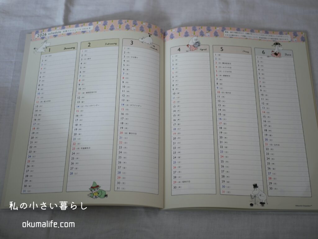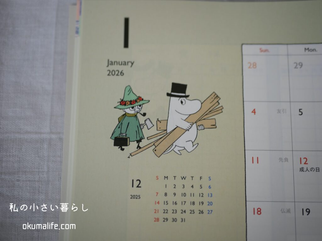 ムーミン家計簿2026年は、2025年12月〜2026年12月までページがあり