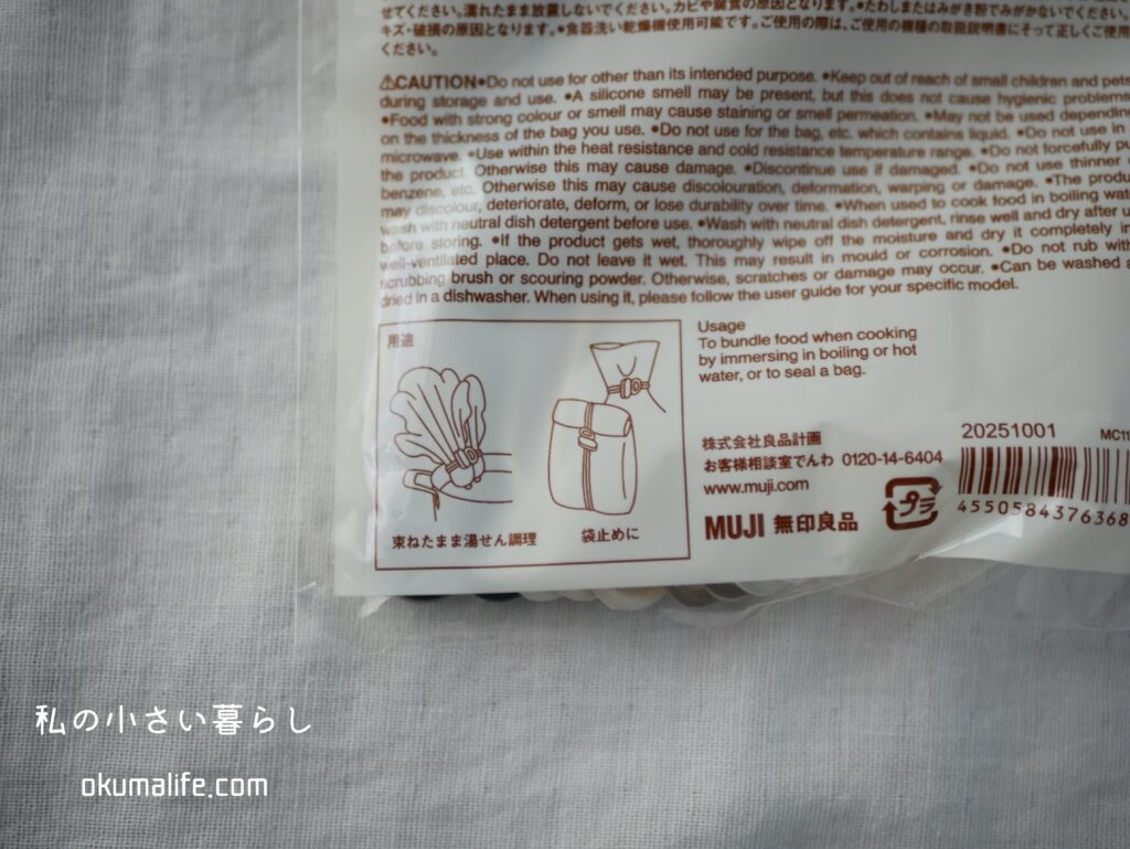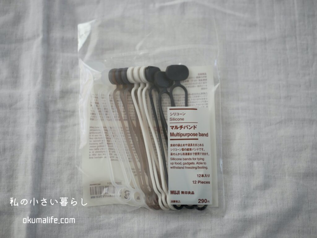 無印のマルチバンドは、食材の袋止めや道具をまとめるシリコーン製の結束バンド。