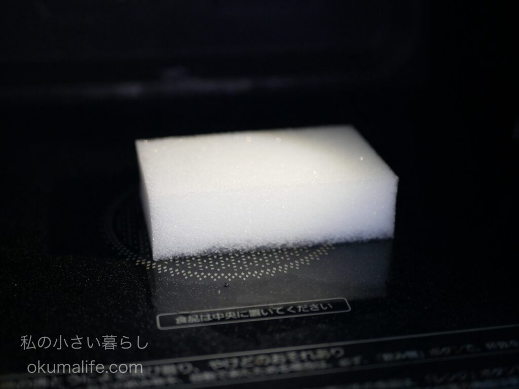 - スポンジを電子レンジ内の中央部(回転皿がある電子レンジは回転皿の上)に置き、スポンジに洗浄剤を染み込ませる