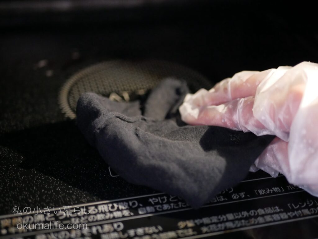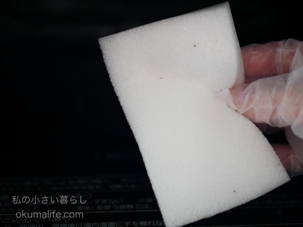- 加熱後、1〜2分してスポンジが熱くないことを確認してから、レンジ内の汚れをスポンジで拭き取る。